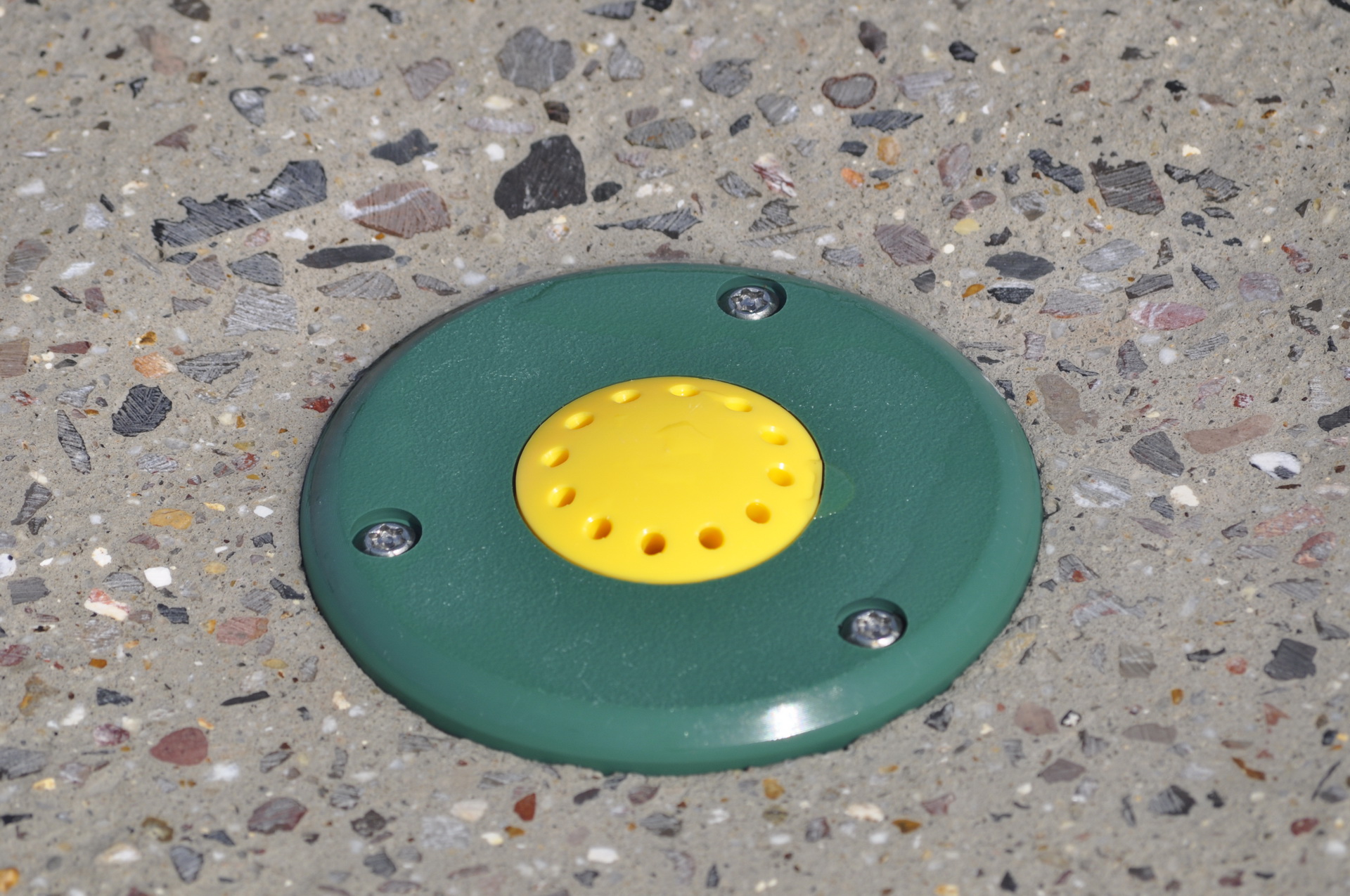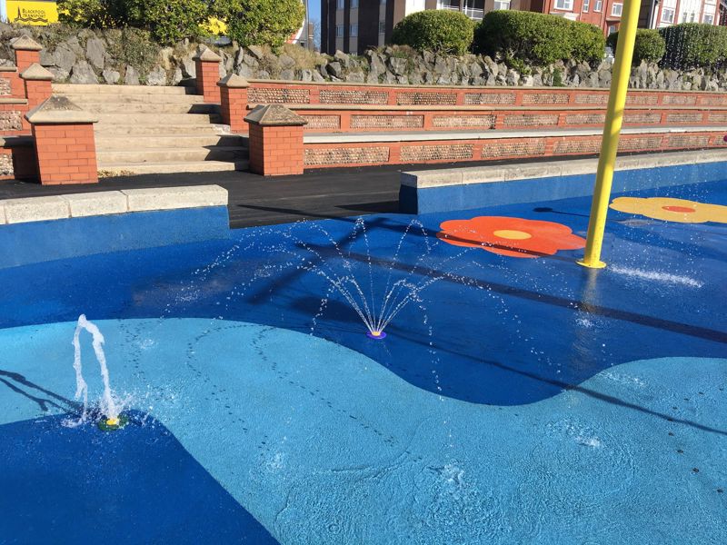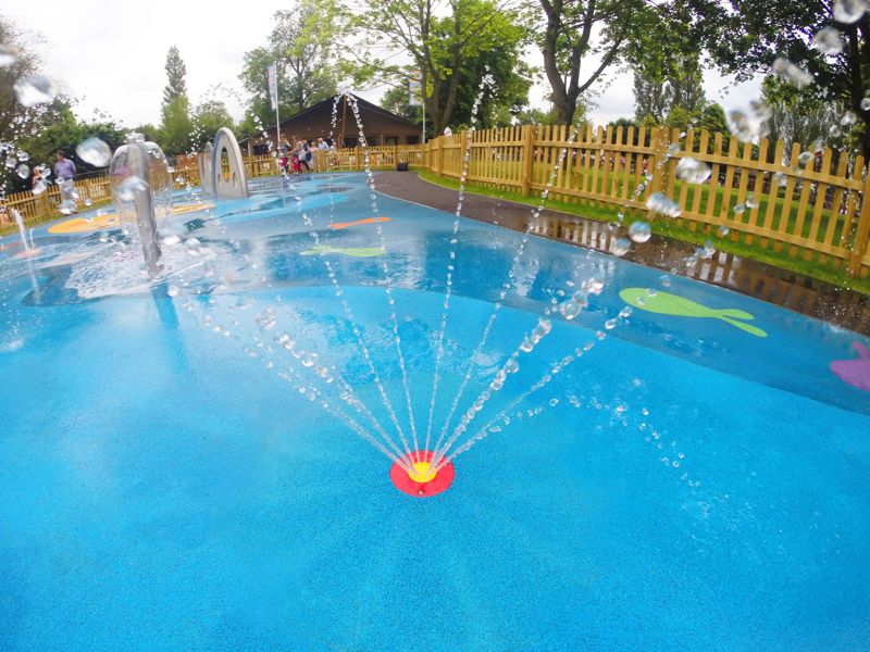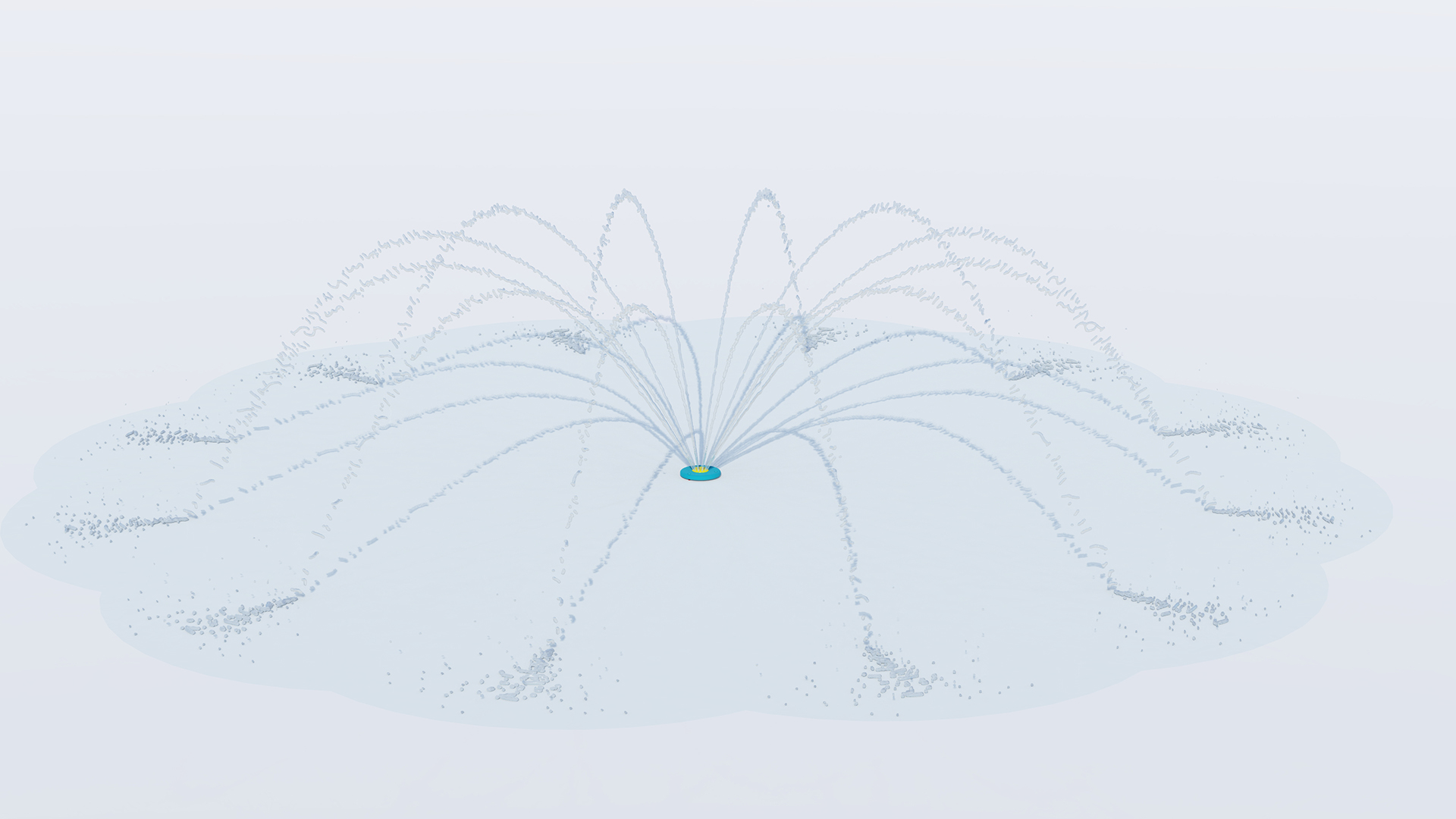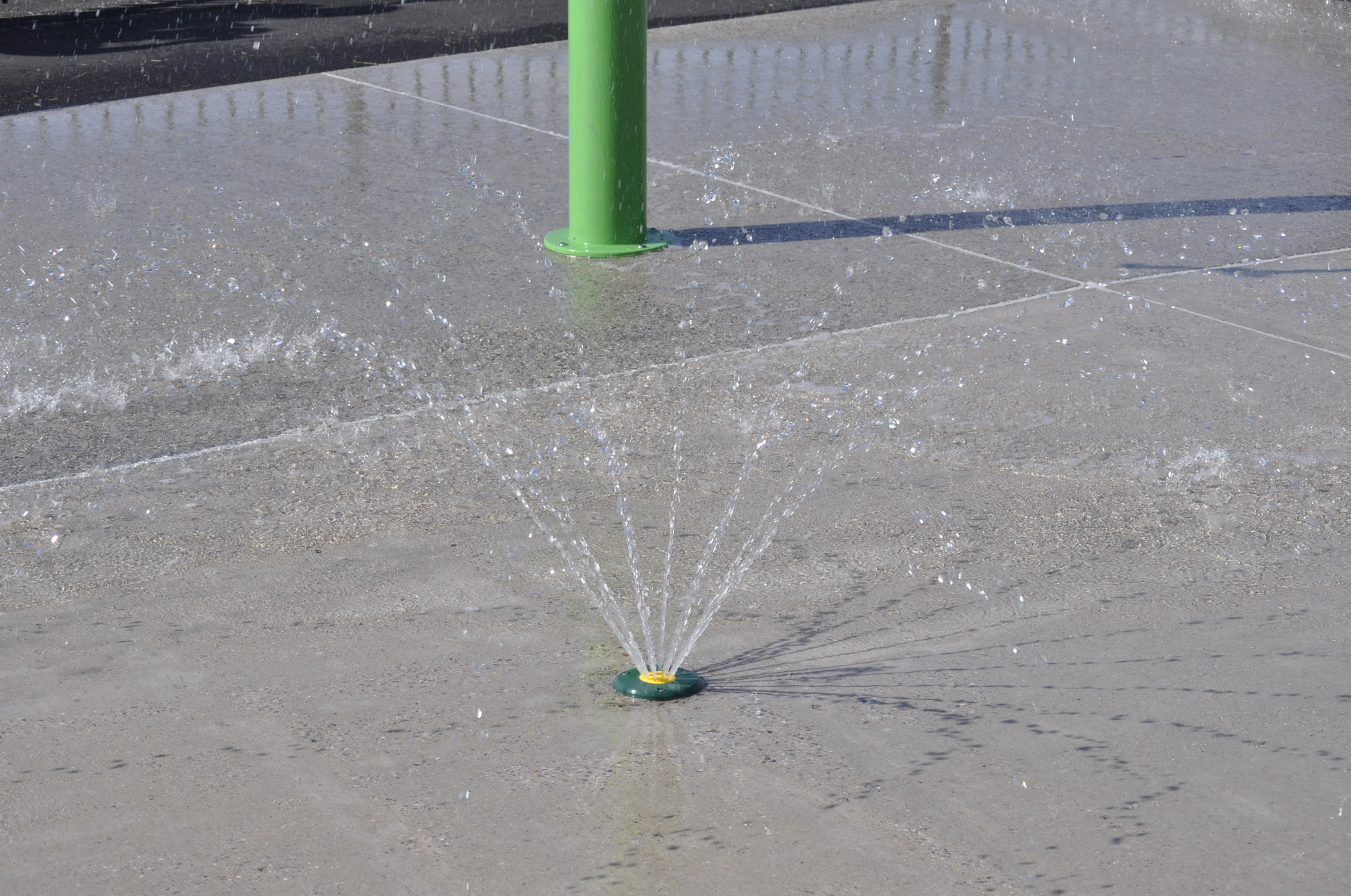 The Water Beasty webs out from the ground up. Kids can run around it under the arching streams.
