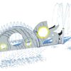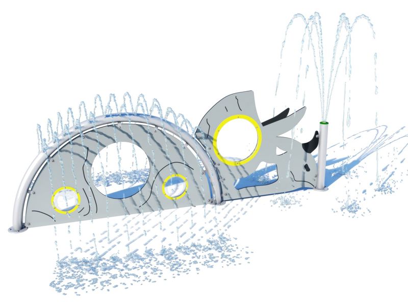 Don't awake the sleeping triceratops. An arched pipe with a number of nozzles create a great interactive water play experience.