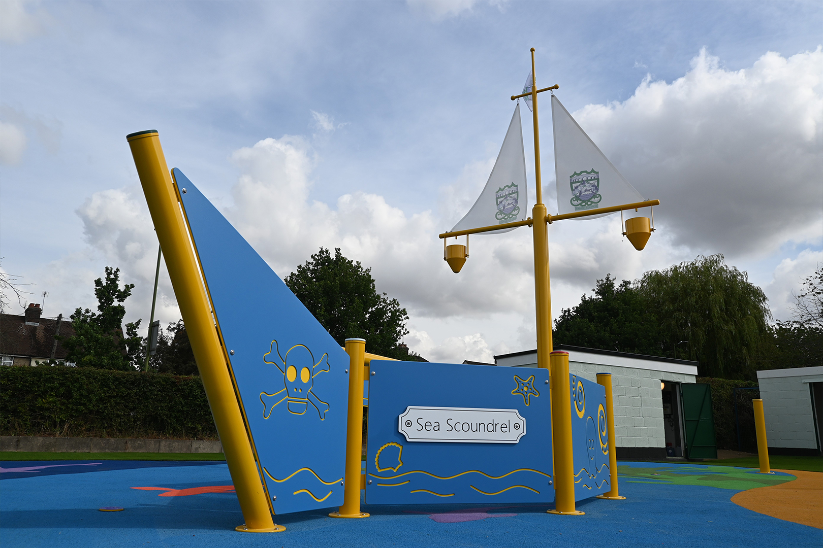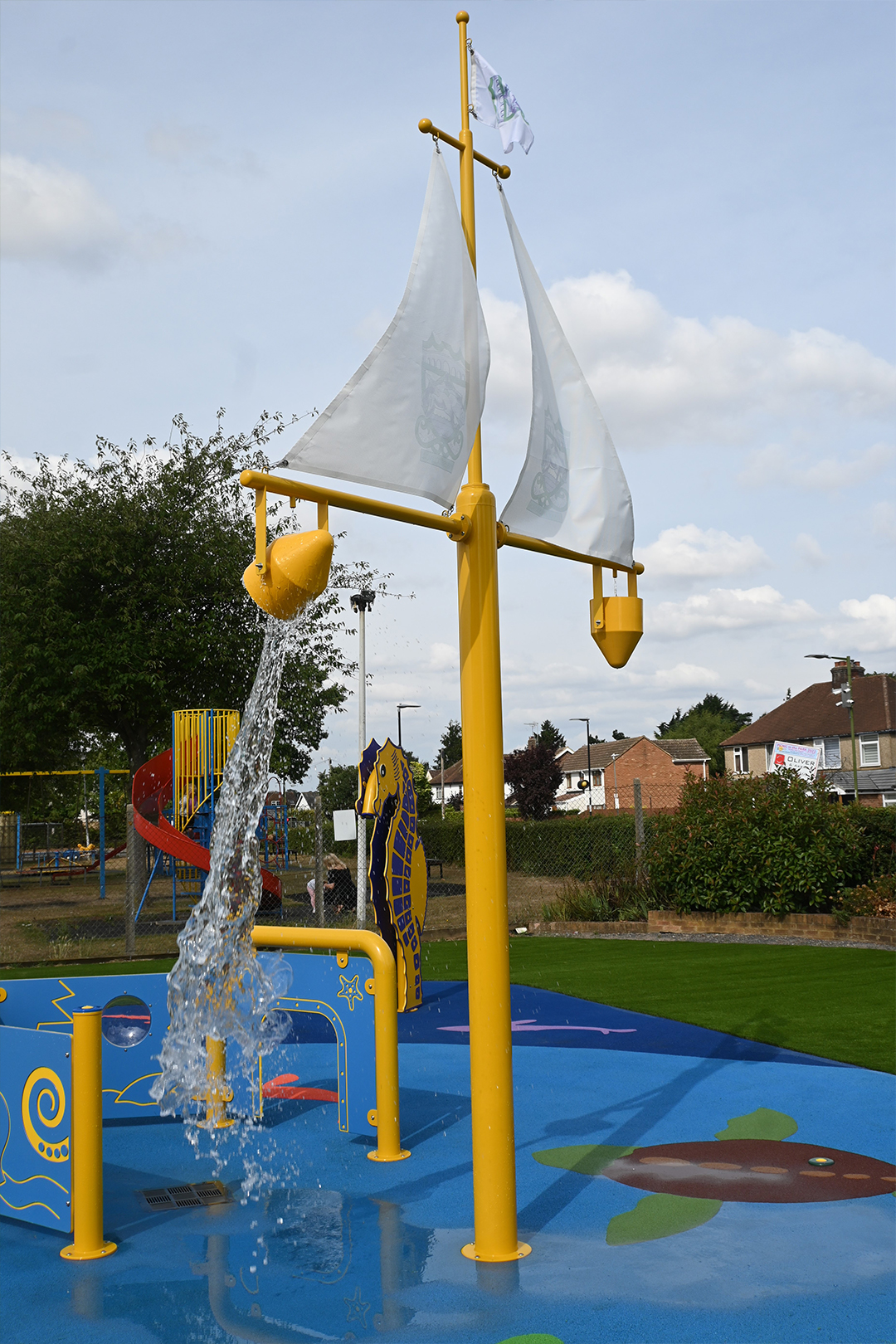 The splash pad is built around a ship adventure theme, allowing children to engage in imaginative play—whether it’s boarding the ship, fighting off pirates, or sailing the seas in search of treasure. At the centre stands the Soaking Sails, equipped with two tipping buckets and a customisable sail that can include the council’s logo, proudly representing the community behind the project.