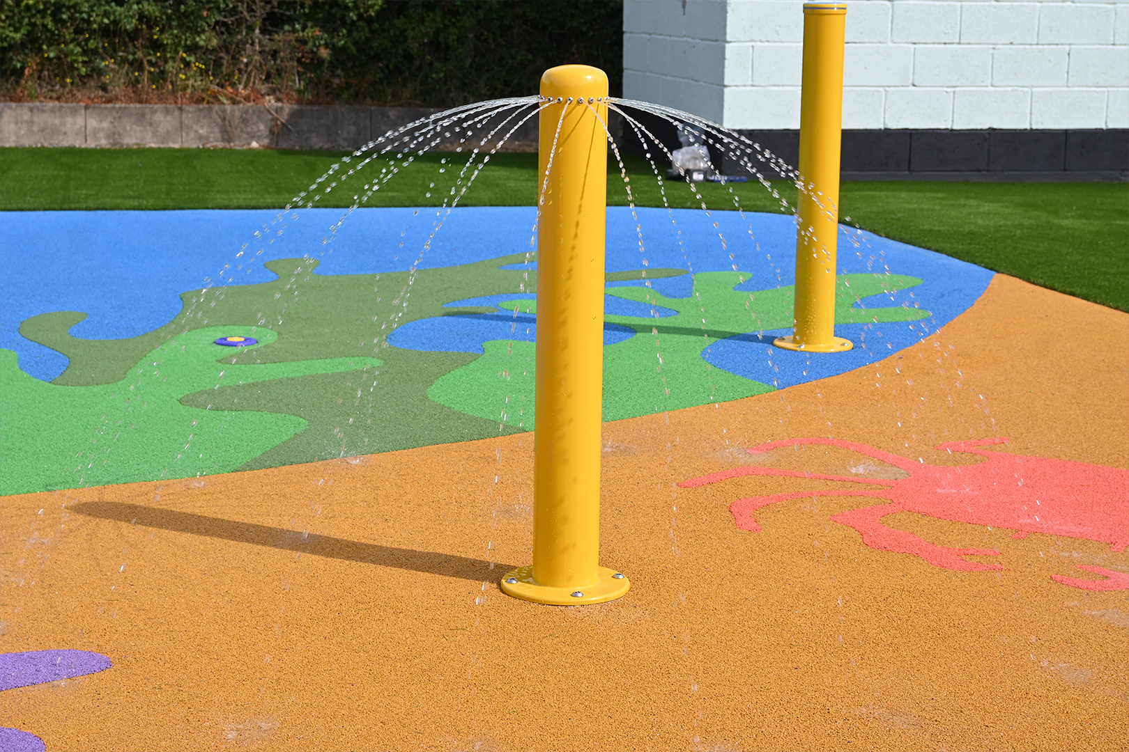 Additional features include the Arching Water Fence and Water Spider, both producing arching water streams that children can crawl under, simulating an underwater adventure. To complete the sensory experience, we utilised a coloured wetpour surface arranged in a beach-style design, creating a gentle and inviting space for younger or less confident users to safely engage with water play.