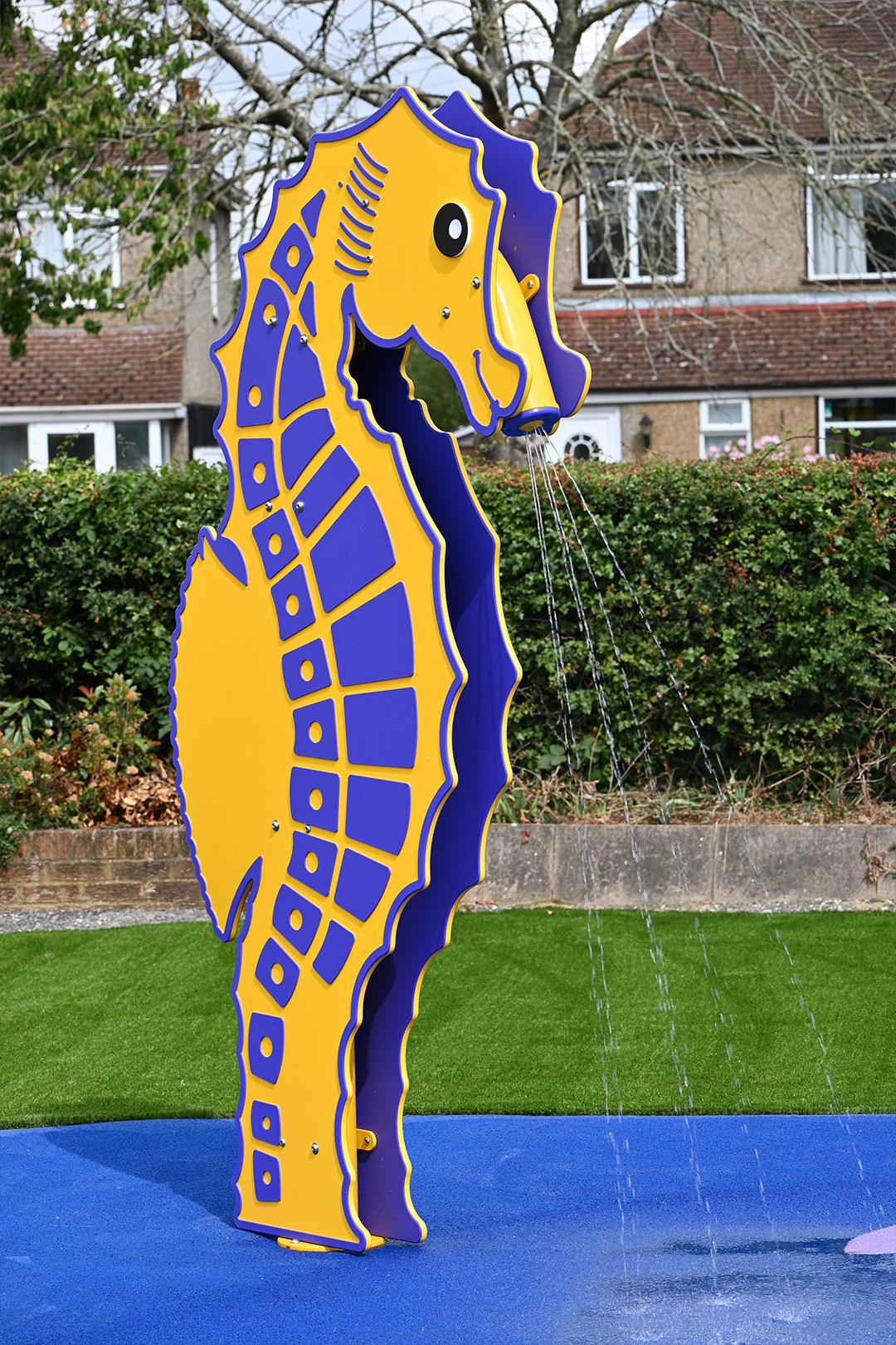 In front of this is the Sea Scoundrel Prow, one of our most popular features, known for its interactive panel with polycarbonate domes and post-mounted water jets, offering multi-level play. In the corner, you’ll find the vibrant Sea Horse Shower, a fun character spraying an aerated blast of water—perfect for deep-sea roleplay and aquatic exploration.