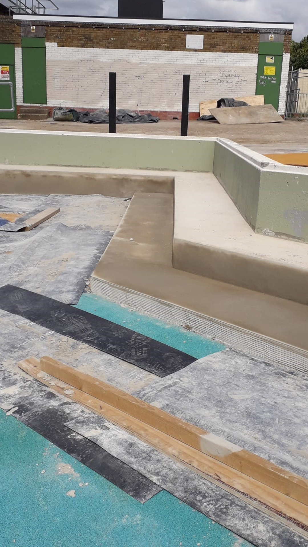 The task was set to design and build into an obscure shape and multiple-levelled paddling pool. We accomplished this by utilizing the existing draining solution, where the top level drains through the wall down into the bottom area. This allowed us to create a paddling zone on the top level while also enabling it to drain to a dry deck overnight. This added value by allowing less confident users to get involved, while still preserving the heritage of the paddling pool.