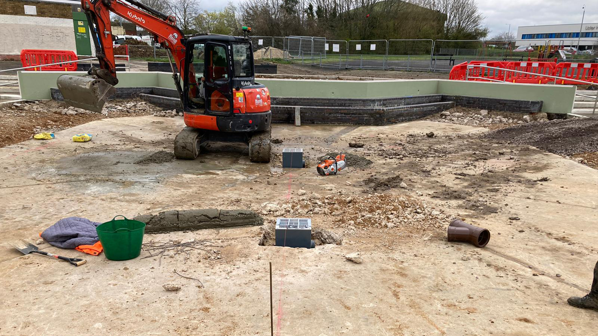 Trenches were dug around the existing pad, and 53 anchors were installed across the splashpad in the agreed locations, along with all the relevant pipework and electrical connections.
