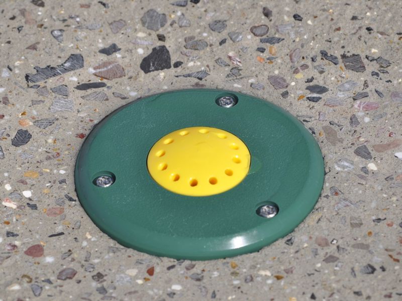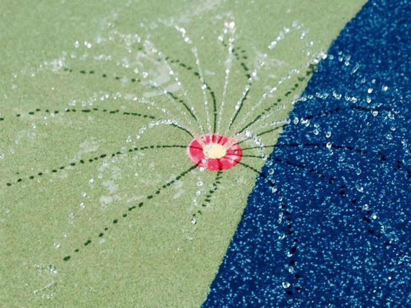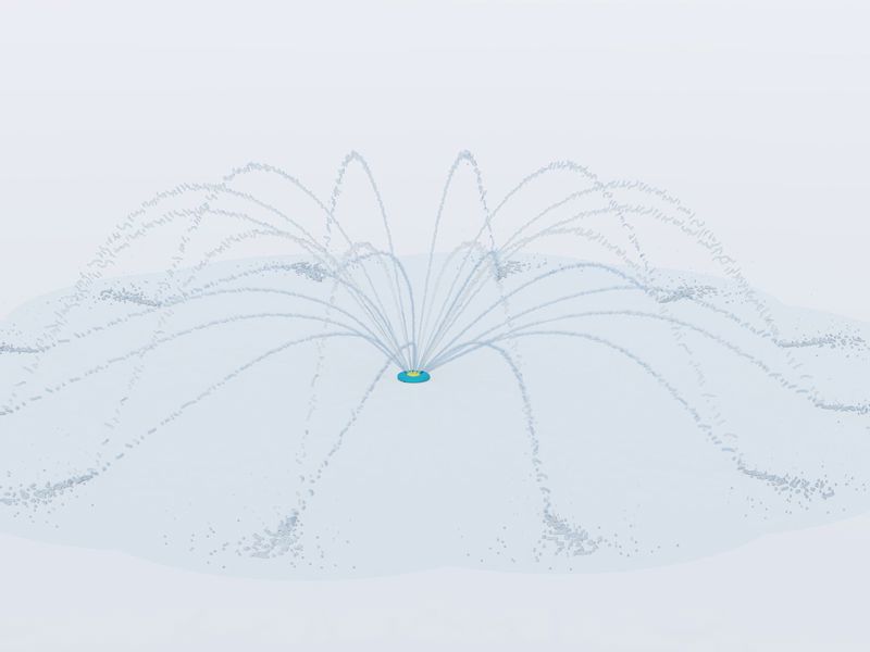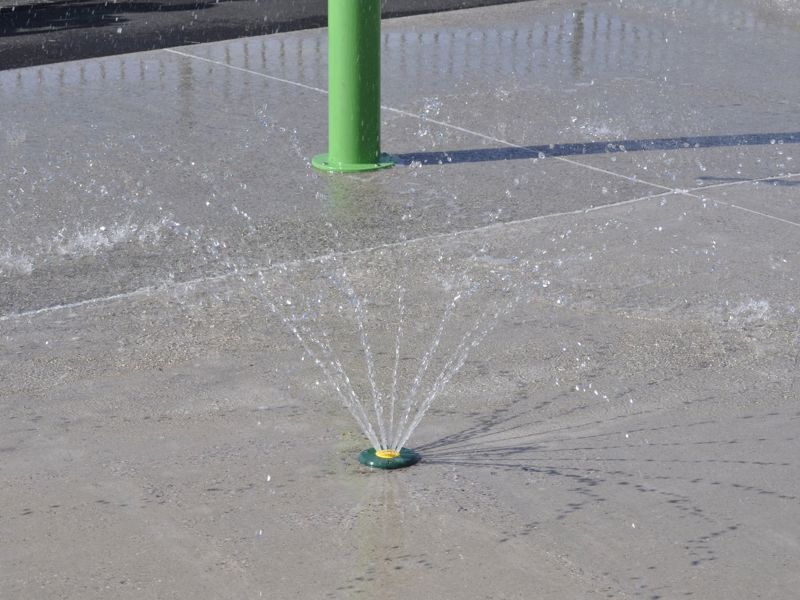 The Water Beasty webs out from the ground up. Kids can run around it under the arching streams.