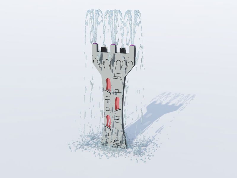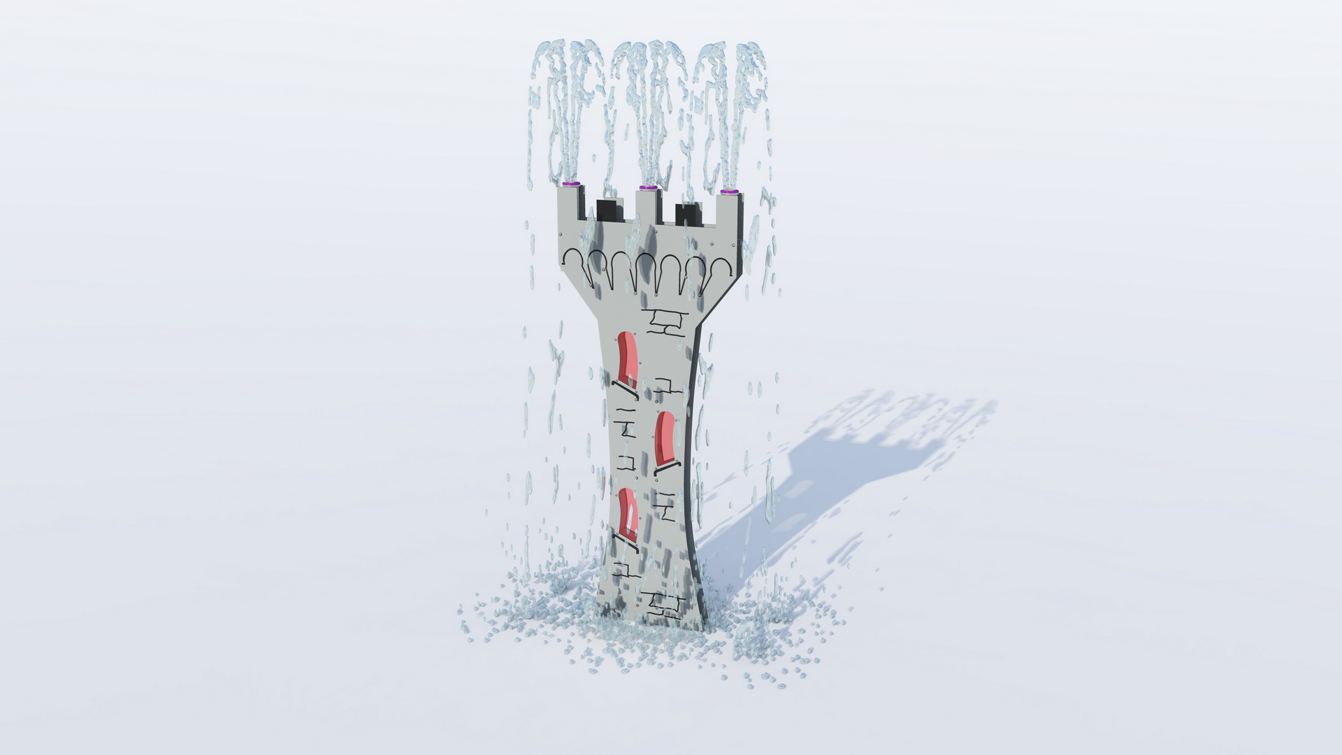 The stylistic Topple Tower reaches 4m high when activated. With 3 water features included this creates a large focal point in a castle themed splash pad.